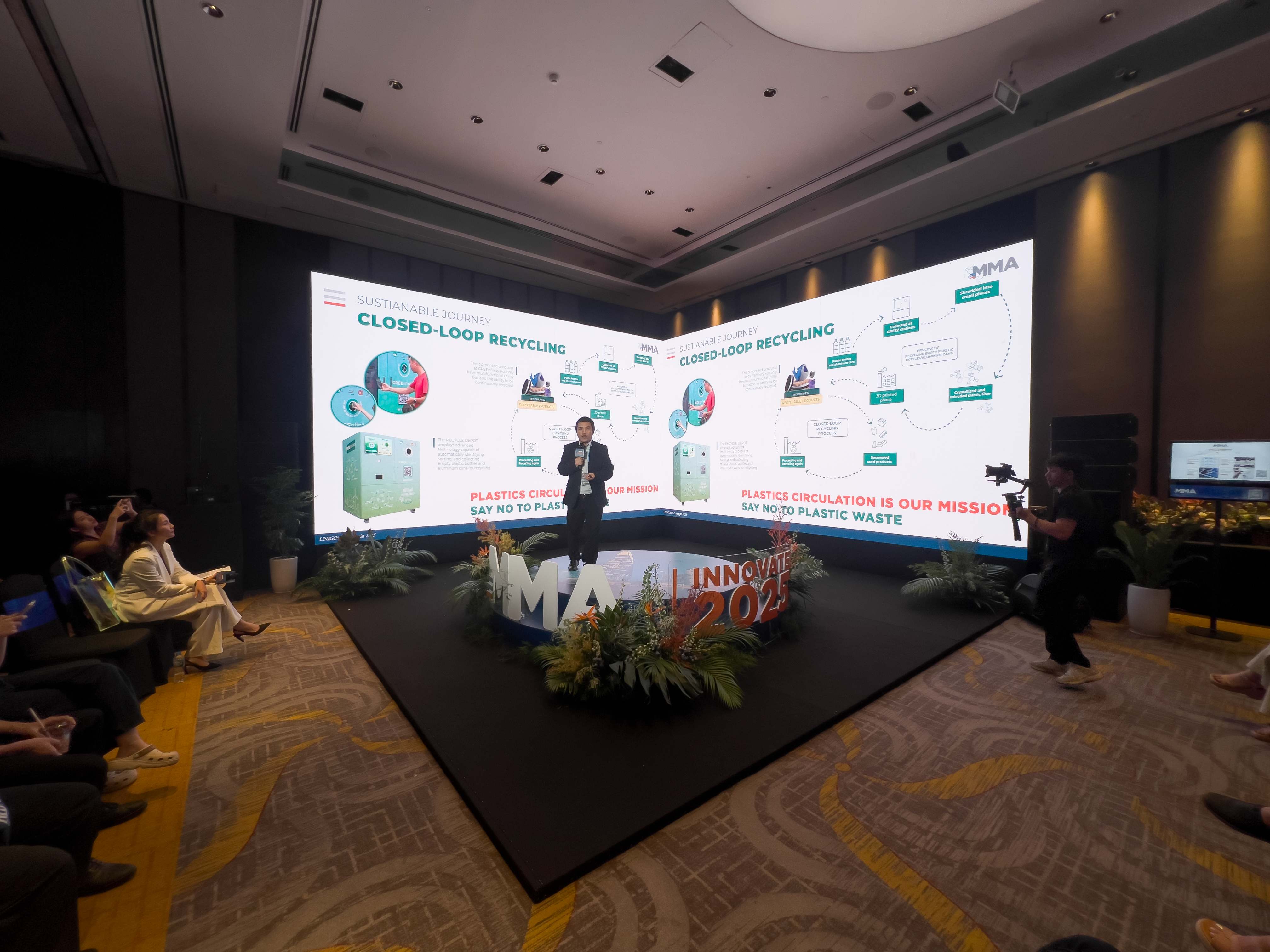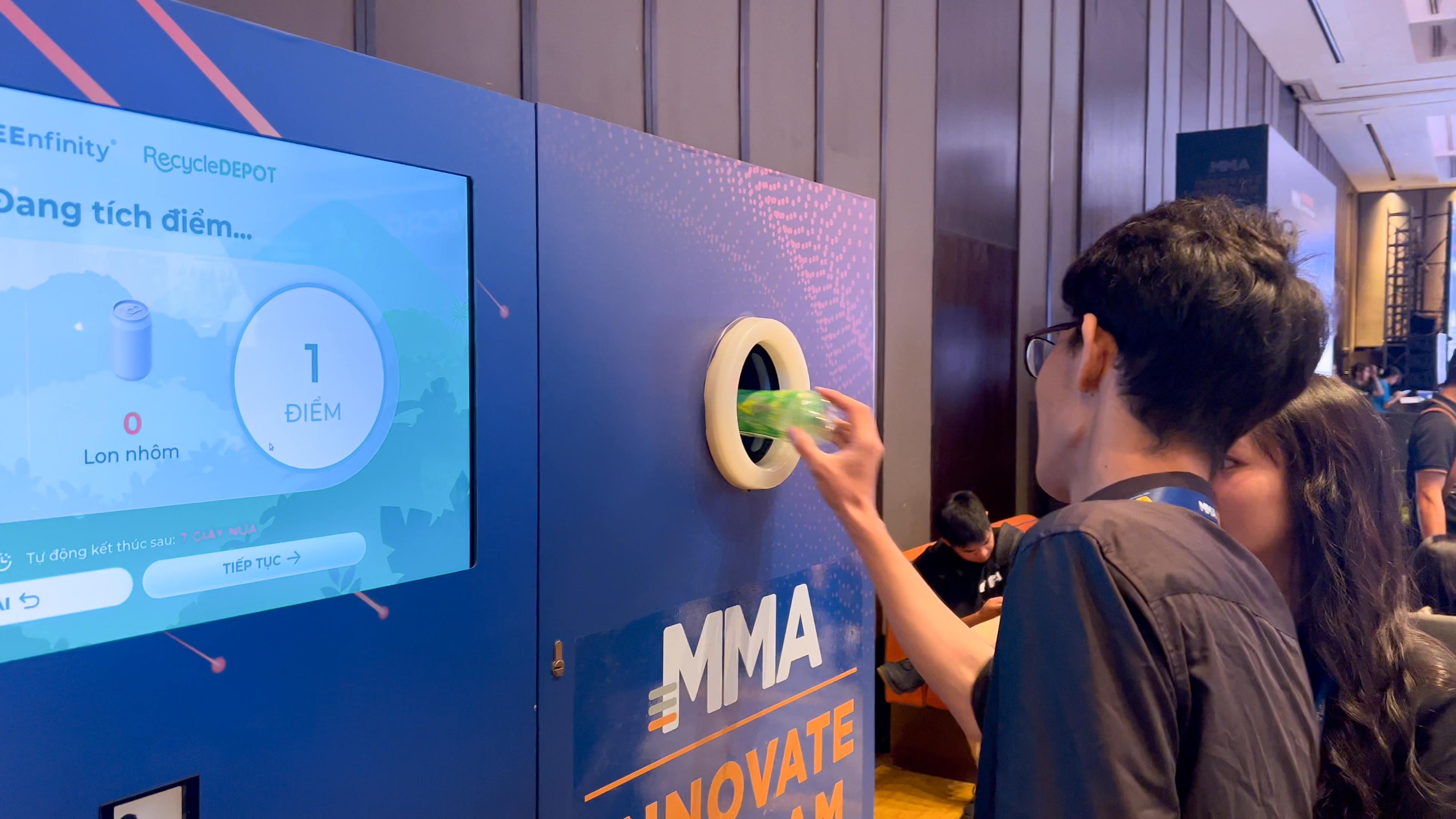 As part of the event, Alta Media partnered with Unigons to showcase a booth at MMA Innovate Vietnam 2025. In the exhibition area, Unigons introduced the Reverse Vending Machine (RVM)—a modern technology solution developed under the GREEnfinity project, designed to automatically identify, sort, and collect used plastic bottles and aluminum cans.
